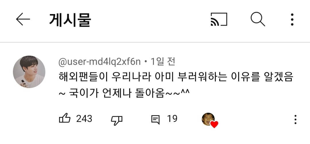 아침 부터 가슴이 벅차오른다. 왜지? 한국에 있으나 미국에 있으나 영상으로만 보는 정국은 똑같은데, 정국이 돌아오는 게 왜케 기쁜것인가? 그냥 정국이가 언제나 돌아오는 곳이 우리나라, 우리 곁이라는 것이 너무 기뻤다. ^^ 이미 우리끼리 하는 흔한 농담인 전정국 보유국~