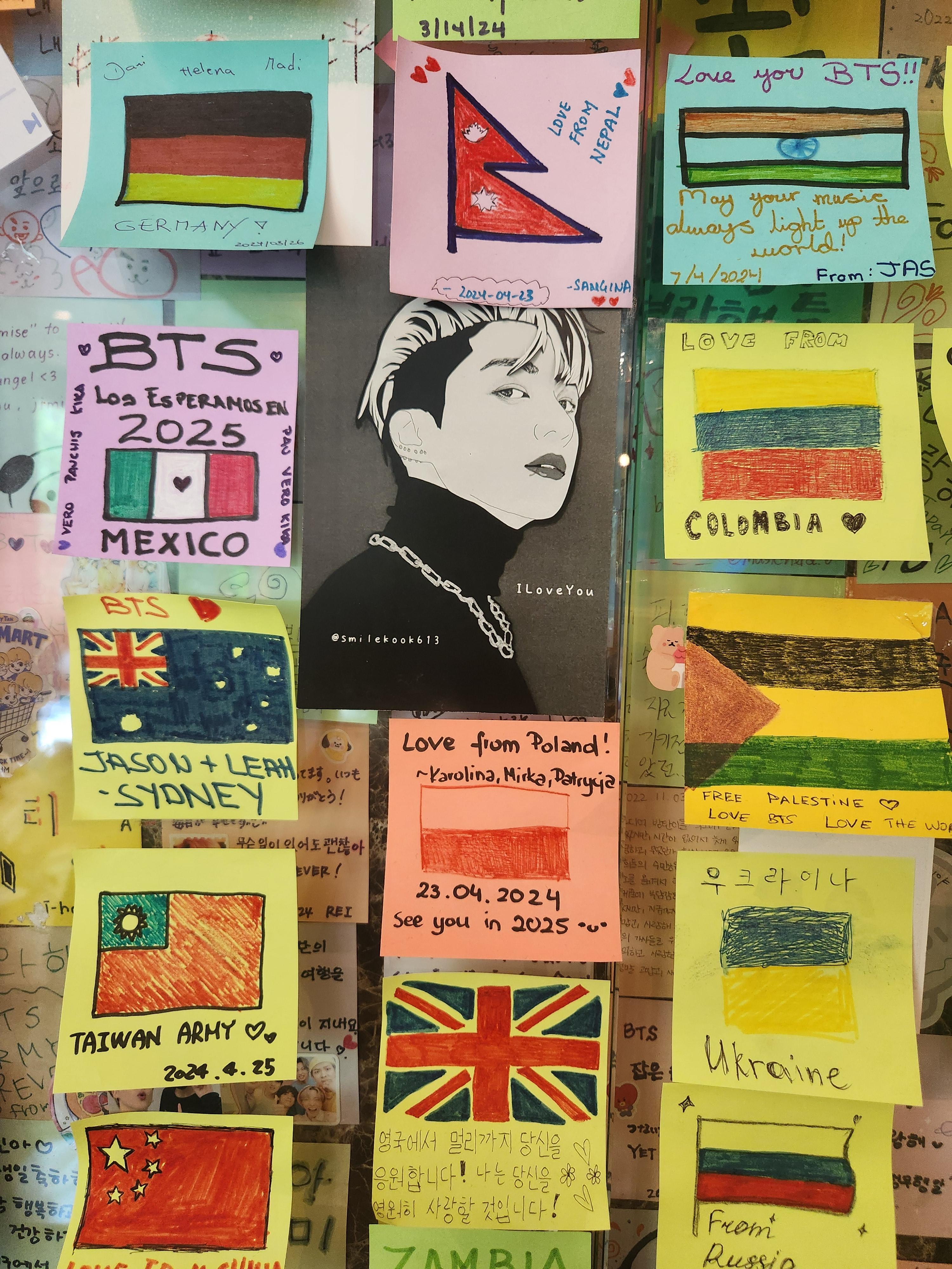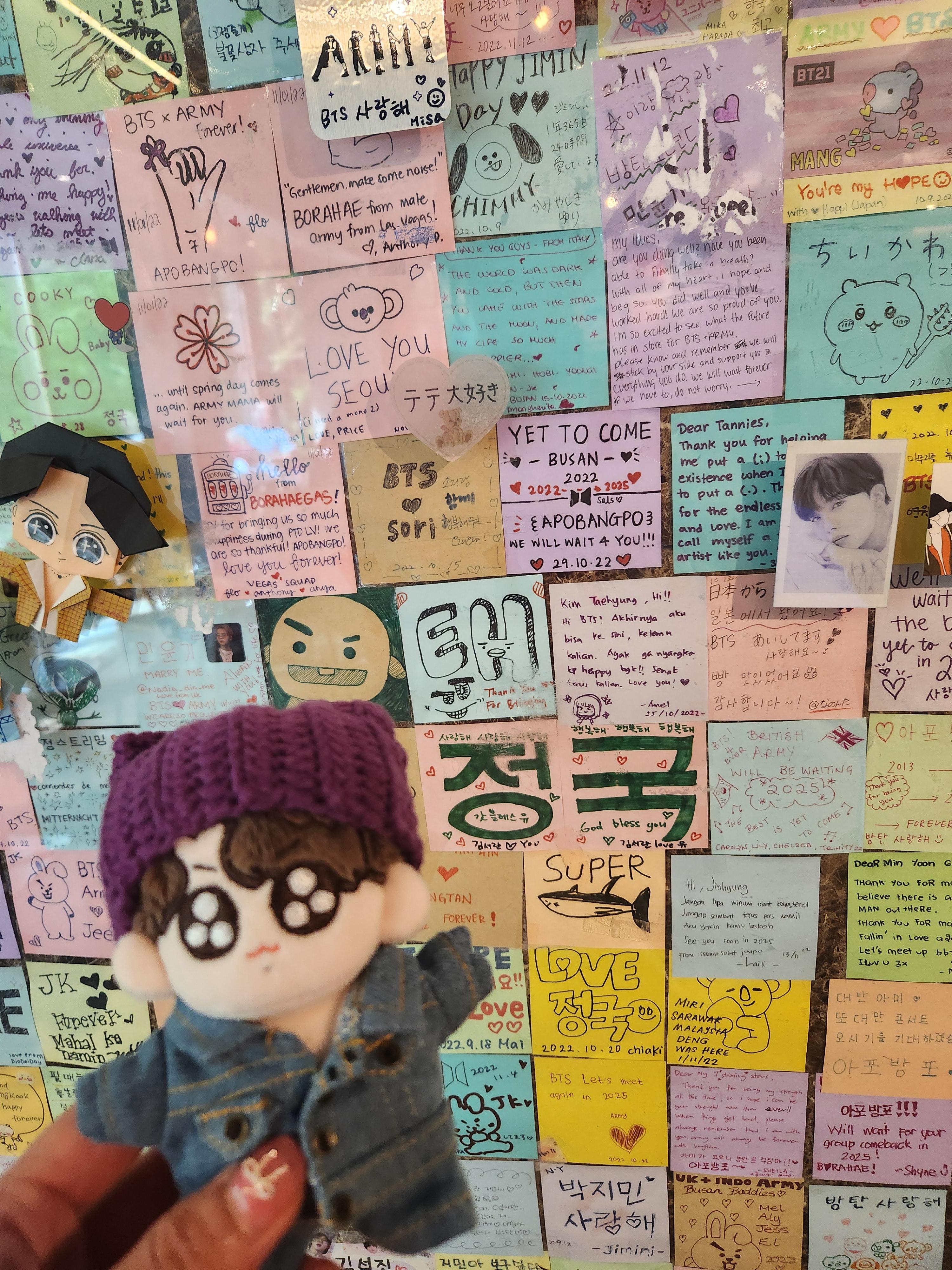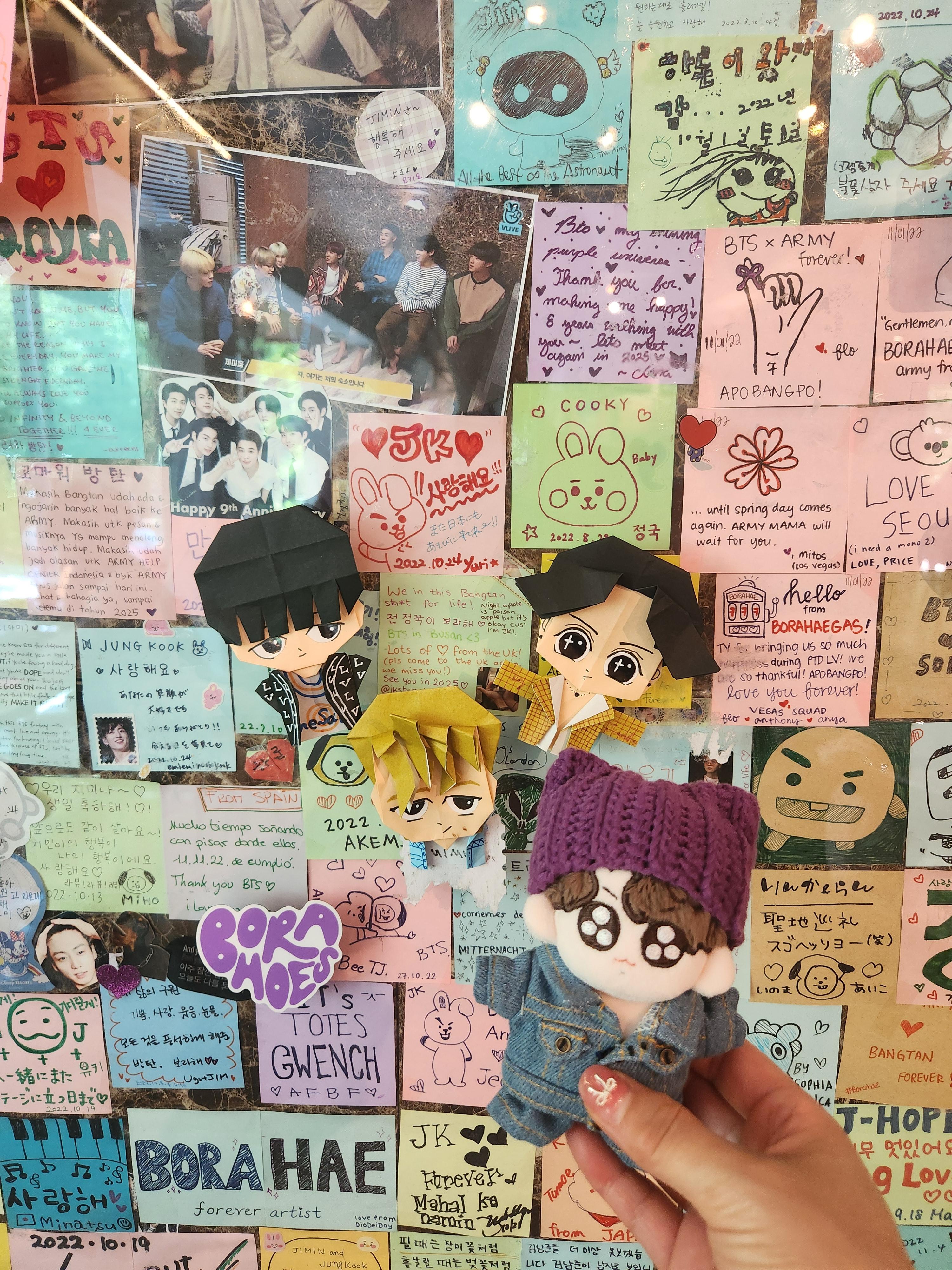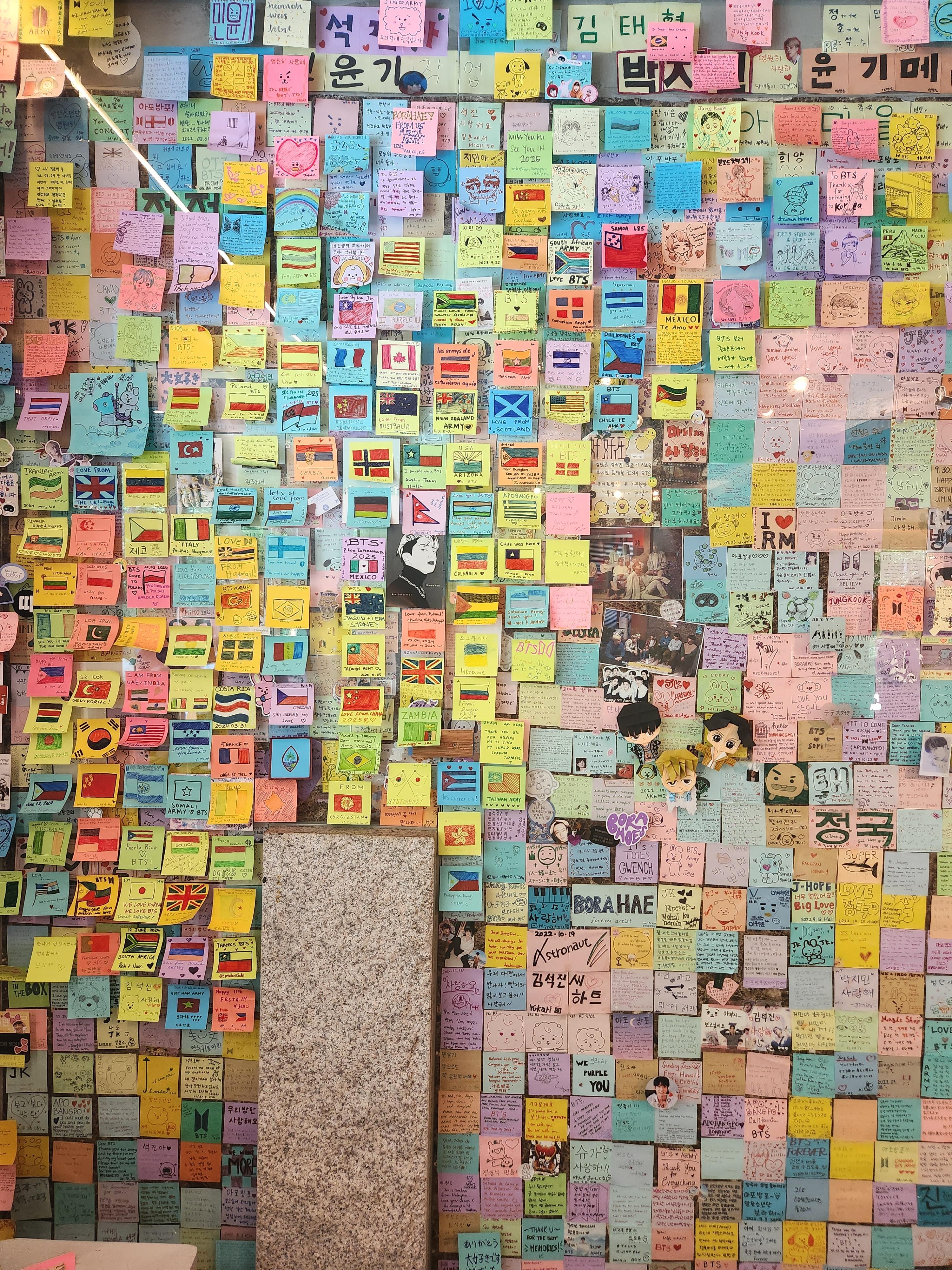 지금은 개조하였지만 지하였던 곳에 정국이방, 1층은 공용 공간이었던거 같고 2층에 슈가.진.제이홉.지민방이 3층에 남준.태형 방이 있다. 각 방마다 전세계 아미들이 꾸며 놓은 사진과 편지들이 있는데 그 정성에 나조차 감동받고 왔다. 분발하자 K-아미~